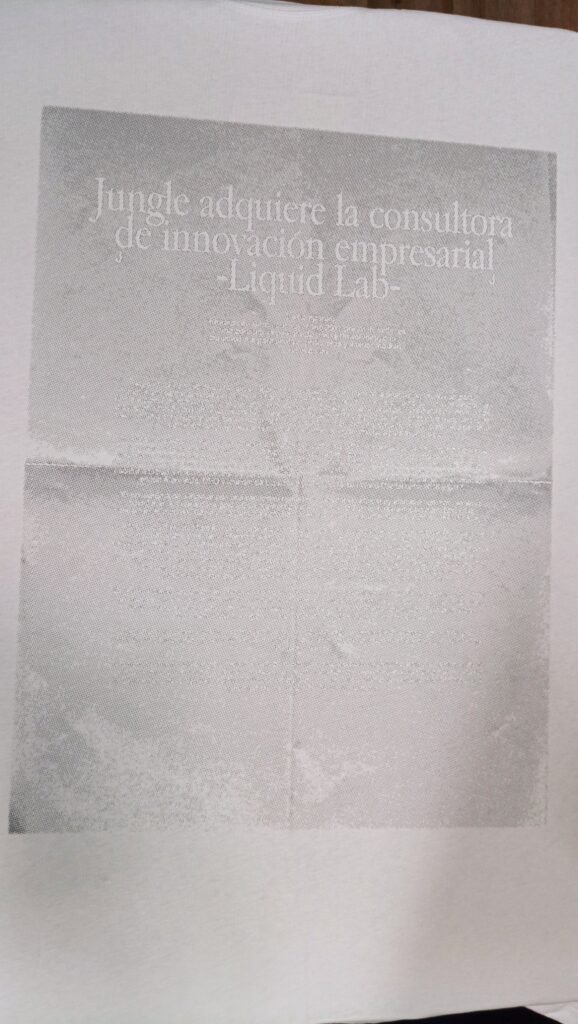 Tintas acramina, base agua, para estampa a dos colores. Una base de gris para, mediante una trama de semitonos, crear el efecto del papel arrugado y fotocopiado, tipo recorte de prensa. El negro para estampar el cuerpo de texto de la noticia, así como el título. Un trabajo fino, realizado con malla amarilla de 61 hilos, para lograr la legibilidad de la noticia en la prenda, con cero tacto y súper resistente a los lavados.