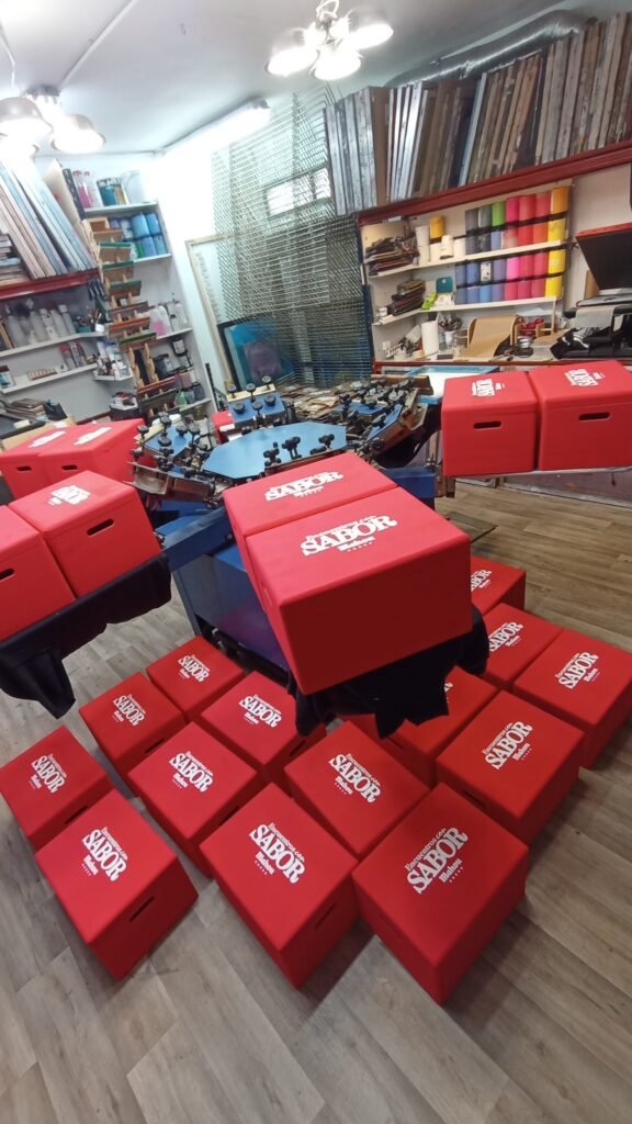 Datos técnicos: Tinta opaca base agua, color blanco. Adaptación del pulpo para el perfecto registro de las cajas de madera, para poder estampar sobre la tapa. Malla de 43 hilos para estampar con tintas eco de serigrafía sobre cajas previamente pintadas de rojo y con un posterior barnizado para mejorar su durabilidad.